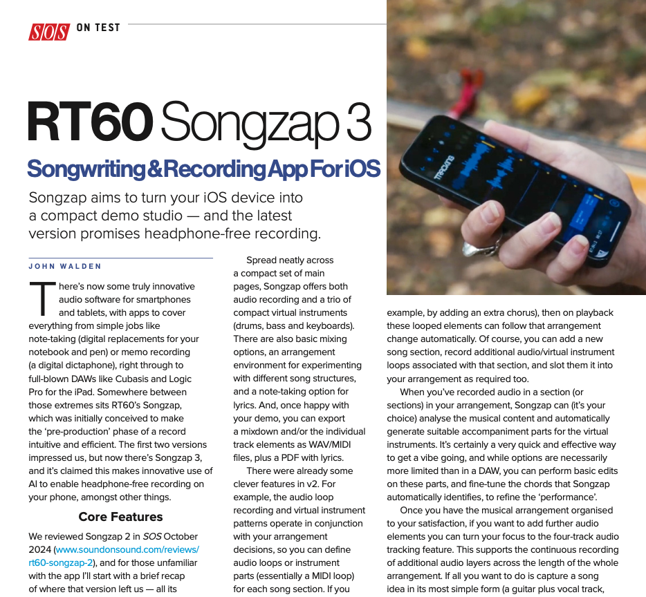 RT60’s Songzap 3 falls very much in that world and brings together a compact set of features that allow you to take a basic musical idea and flesh it out into a demo level production using just your iOPS device. With some neat tech elements, if you are serious about your songwriting, it’s well worth checking out to see if it might suit your personal songwriting process. Read the full SOS review here and see what you think…. 🙂