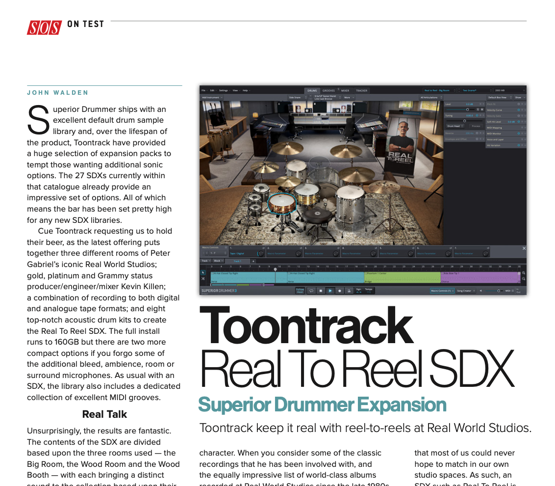 The Real To Reel SDX is one of the latest additions on that front. Recorded in Peter Gabriel’s epic Real World Studios in collaboration with Kevin Killen, this SDX captures the essence of the drum sounds that space has provided for any number of hits songs and albums. Want a slice of drum sound history easily available on your own computer-based studio system? Then check out the SOS review here….